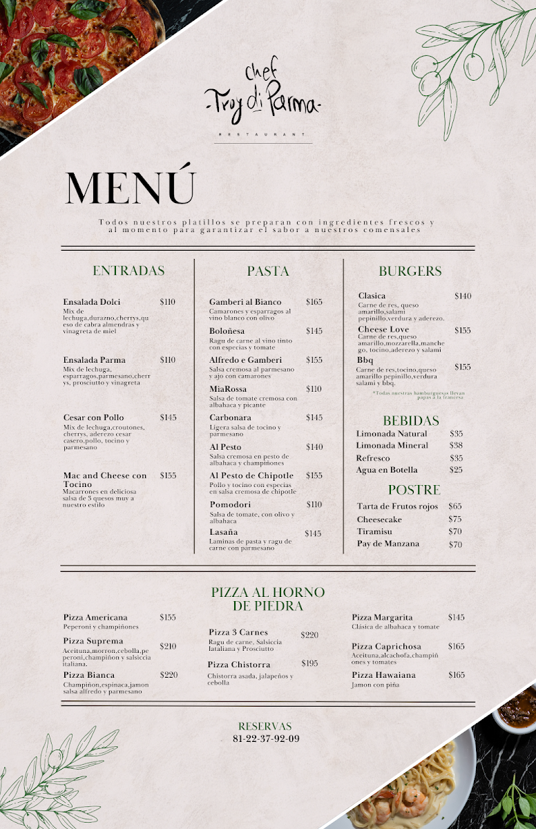 Welcome to Chef Troy di Parma -Restaurant-, a gem located in Cdad. Santa Catarina, Mexico, offering a cozy atmosphere perfect for enjoying authentic Italian cuisine. The menu features an array of mouth-watering dishes, with highlights including the Margherita pizza, praised for its perfect crust and fresh ingredients, and the indulgent Alfredo pasta and chipotle chicken that come in generous portions, ensuring satisfaction with every bite.